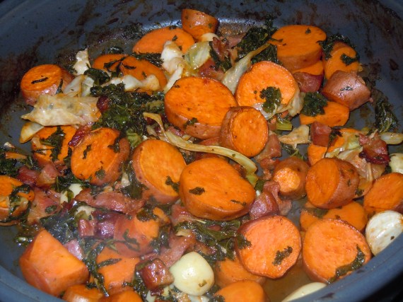 Personally I think that some alliums are always needed for a really good flavor, and if green garlic was not in season I would use perennial green onions or garlic chives, both of which will grow extremely happily in almost anybody’s soil. But don’t get too concerned about specific ingredients, just think about what is fresh and what tastes good together. The whole idea is to have the pleasure of something on your plate that tastes of the growing season.