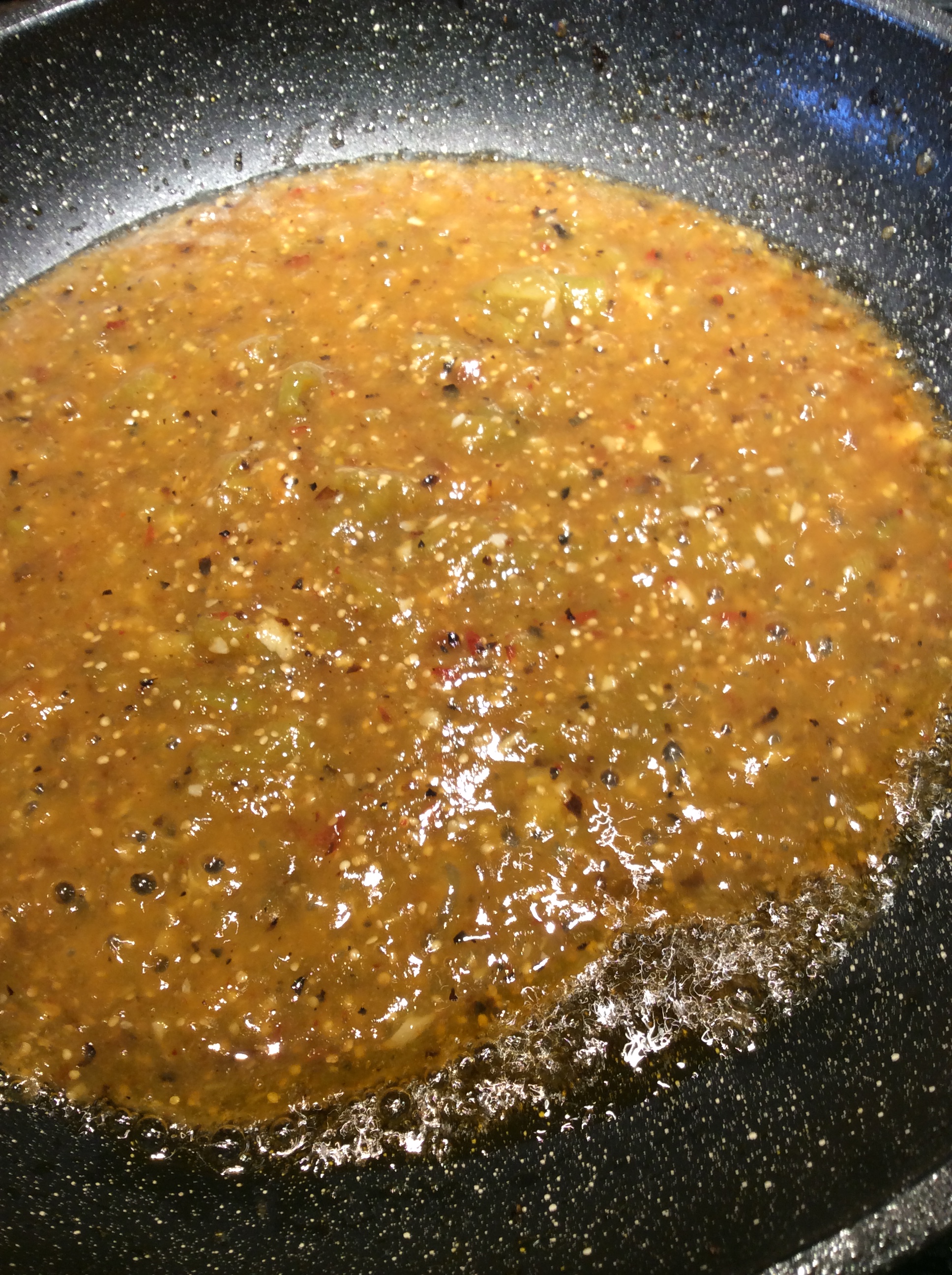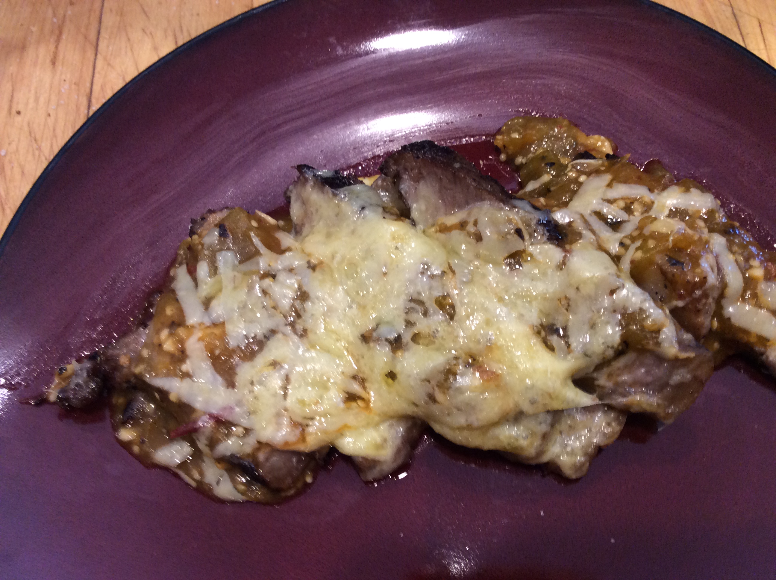 Now, I add the quintessentially Mexican step of frying the salsa.  In my largest skillet I heat 2 tablespoons of chosen fat, in this case fat from my homemade bacon. When the fat is hot, pour in the pureed salsa. It should sizzle furiously.  Fry it over high heat for a couple of minutes, until it has thickened to the degree that you want.  Salt to taste, and it is ready to use. The frying step smooths and blends the flavors in a delicious way. It’s good hot on grilled or smoked meat, gratineed with cheese, room temp with chips, or any way you like to eat salsa. I especially like the tangy-smoky flavor on grilled vegetables or mixed into cooked greens just before serving, or on top of them with a good sprinkling of Cotija or queso fresco. At the top of the page you see my lunch today, a little piece of leftover steak sliced and broiled with salsa and smoked cheddar on top, a fitting reward for the very minimal labor of making the salsa.