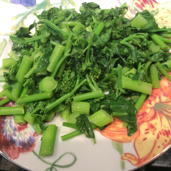 I read that the buds could be harvested as a broccoli like vegetable, and when I first tried this, they were tasty enough but very tiny indeed. From my four plants, I got enough for one small tasting dish, and no more. But this year I figured out that the bloom stalk is also tender and tasty.  Harvest the whole stalk as close to the base of the plant as you can get without damaging any leaves. Do this before the flowers open, and it will just snap right off. The leaves on the stalk are fine to eat. The lower part of the stem has a tough fibrous outer layer, but it peels off very easily. Everything you have left, stems, leaves, and buds, is good to eat.  Cut in half inch cross sections, cook in very little water until crisp tender, add salt and butter, and eat.  Treated this way, each plant provides a nice vegetable side dish for two people.