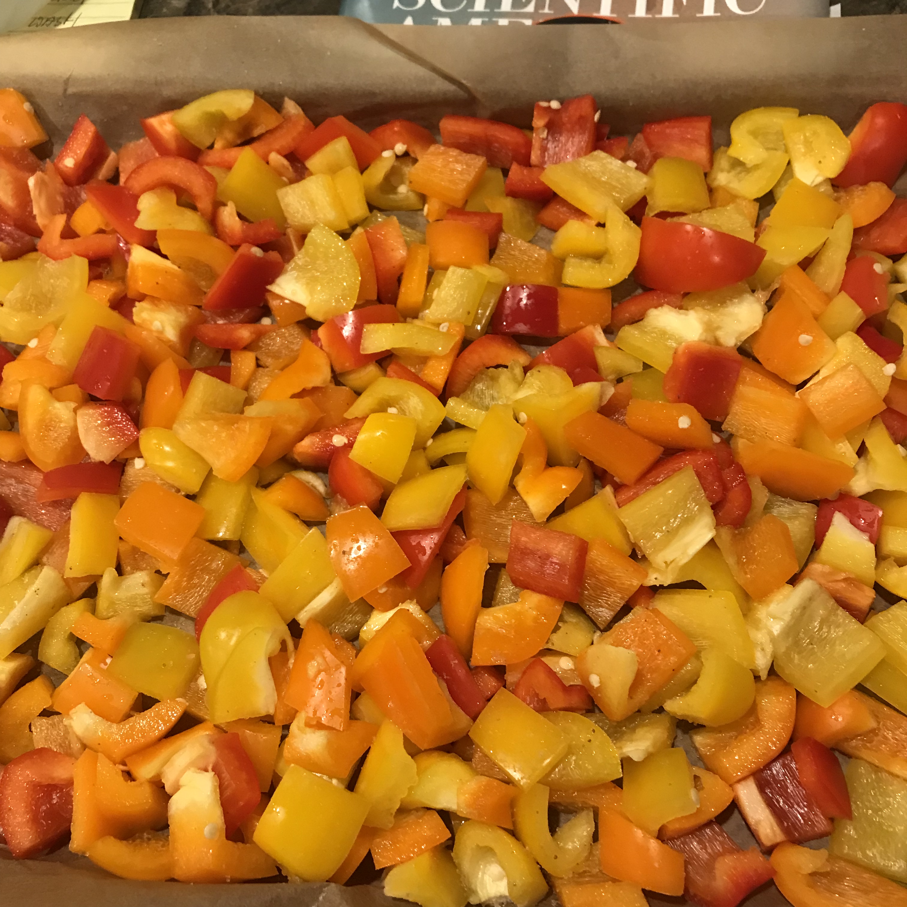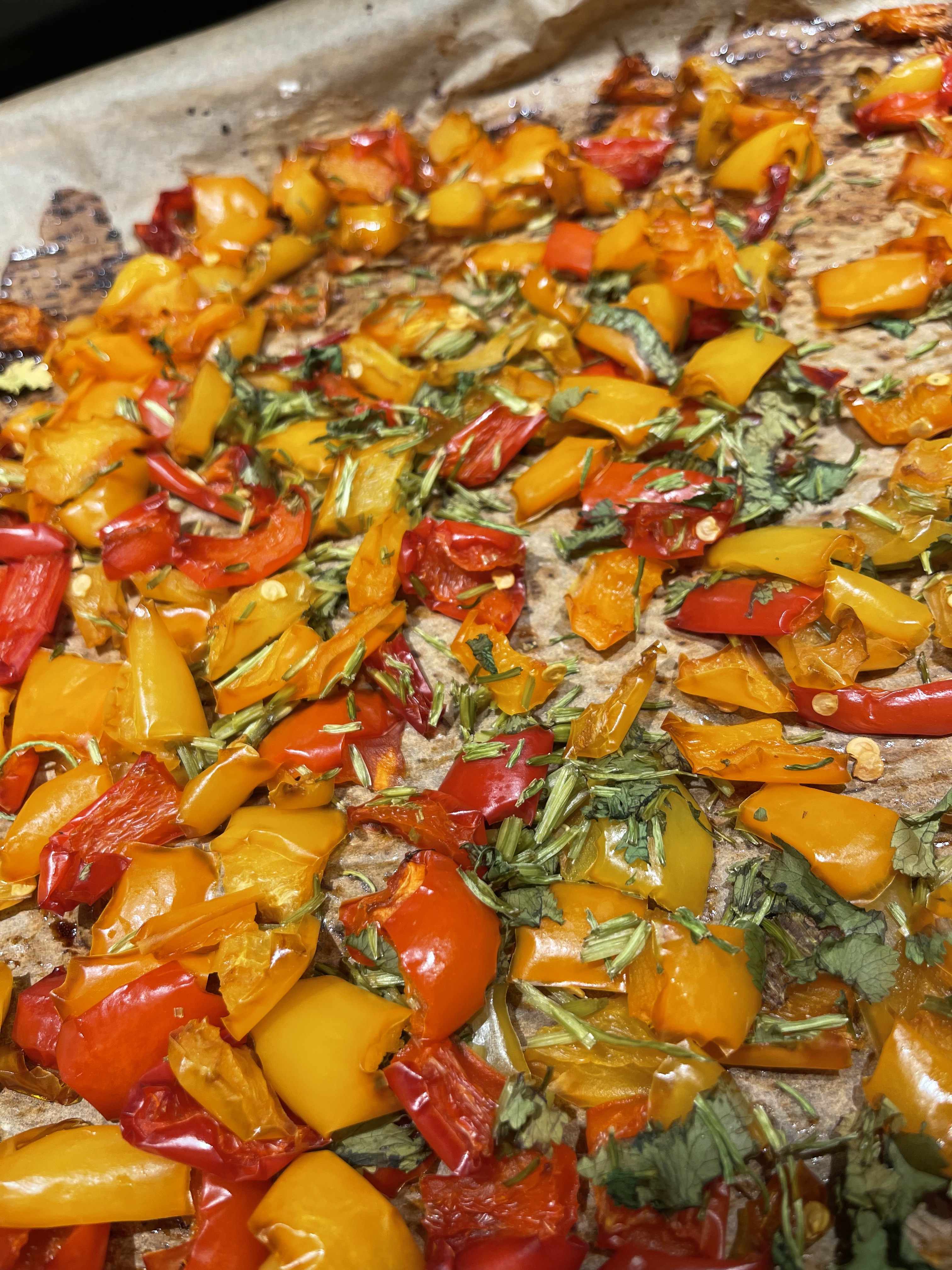 Then, start with your bell peppers. While making a run through a big box store I picked up a bag of six bell peppers, two each of red, orange, and yellow. You can use any combination of these colors that you want, and you can substitute a green bell pepper for one of the ripe ones if you want to. Wash the peppers, seed and core them, and cut them in chunks. Put them on a baking sheet. If you want to use fresh jalapeños for the hot element, seed and core one or two, cut in chunks, and add to the bell peppers. If you line the baking sheet with baking parchment, it will make your life easier later on. Roast at 325° for 30 minutes, then put the chopped garlic and chopped cilantro stems on the sheet too and continue roasting to your preferred degree of doneness, which for me is when they have a definitely roasted look as shown below. Keep the garlic by itself so that you can take it off the sheet if it’s browning too fast. Be sure not to let the garlic turn brown or burn.