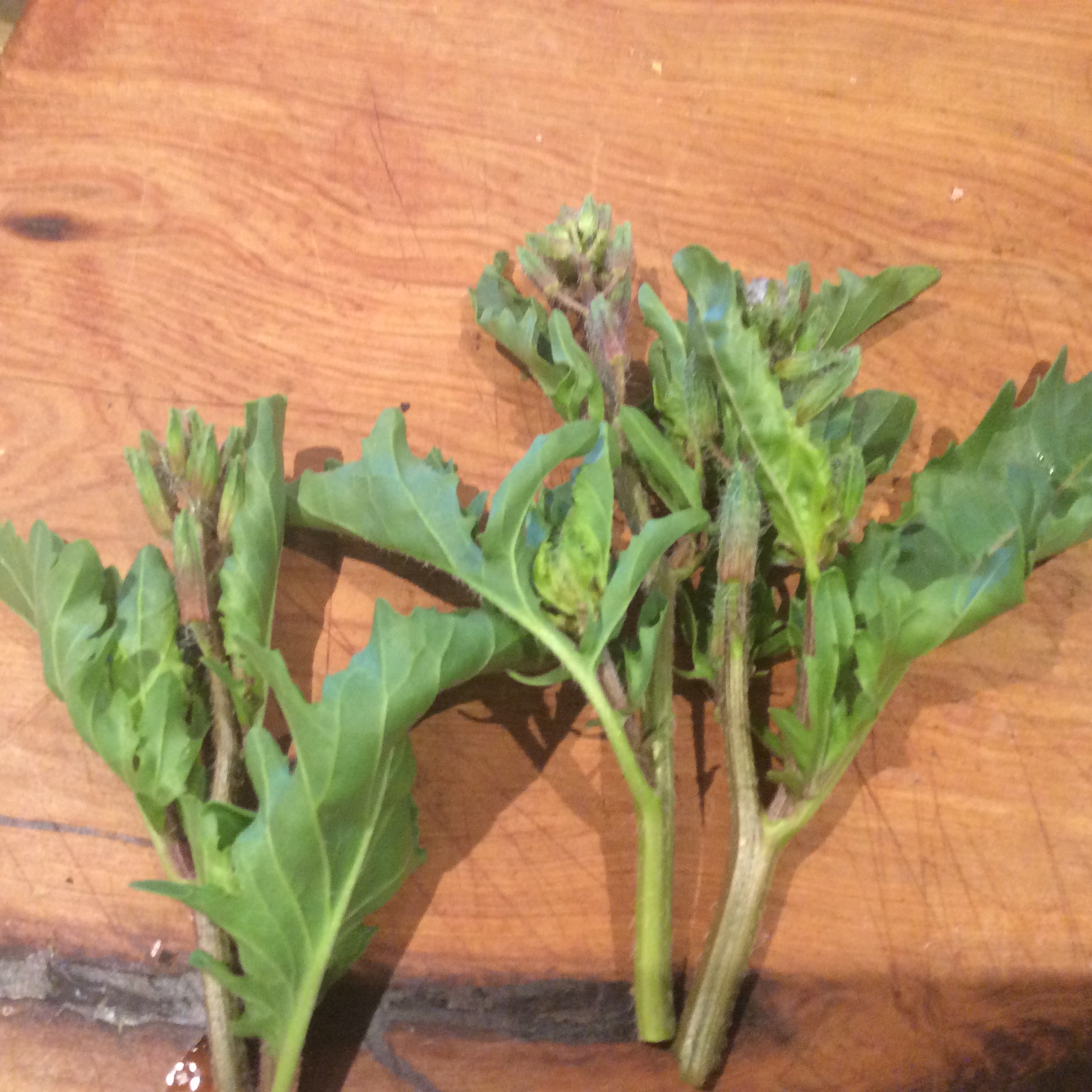 Last year I finally got around to planting the perennial vegetable Turkish rocket, Bunius orientalis, and this year I was able to experiment with it in the kitchen. I had read that it was invasive and so I limited myself to five plants that I could watch carefully, meaning that my experiments were on a very small scale. So far, here’s what I found: