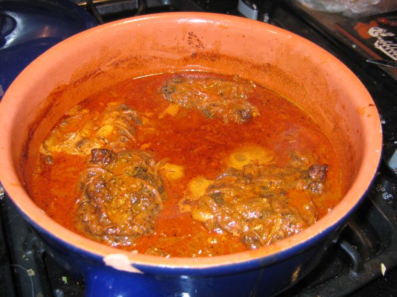 Once some good enriched broth is hanging out in your kitchen, what do you do with it? There is almost no pan-grilled or roasted meat that can’t be improved by a simple reduction sauce. Remove the meat from the pan, pour a cup of good broth into the pan over high heat, boil hard and scrape all the lovely browned bits into the broth, and when it’s reduced to a few tablespoons and has a syrupy consistency, swirl in a tablespoon of butter and serve immediately. A glug of good red or white wine, depending on the meat and seasoning, can be added to the pan for the initial deglazing, then add the stock and boil down. If you want to get fancier, most of the sauces of classic French Cuisine are at your command when you have really good broth to start with, and you can check out Glorious French Food or another cookbook to consider your options. Grains like rice and bulgur are delicious when ccoked in broth. If you’re a fan of Mexican cooking, you’ll want to try Zarela Martinez’s trick of toasting dried chiles of various kinds and then soaking them in broth rather than water before grinding them into a mole’ paste or other flavoring paste. Great stews like coq au vin are within your reach, although they will use up a lot of broth, which is why you make a lot in the first place. A paprikash like the one above requires little more than a meaty main ingredient, top-notch paprika, and really good broth (my own far-from-conventional recipe is below.)When I’m feeling dispirited and glum I revert to my Louisiana roots and make gumbo, and it invariably cheers me up, and usually cheers some other people too.