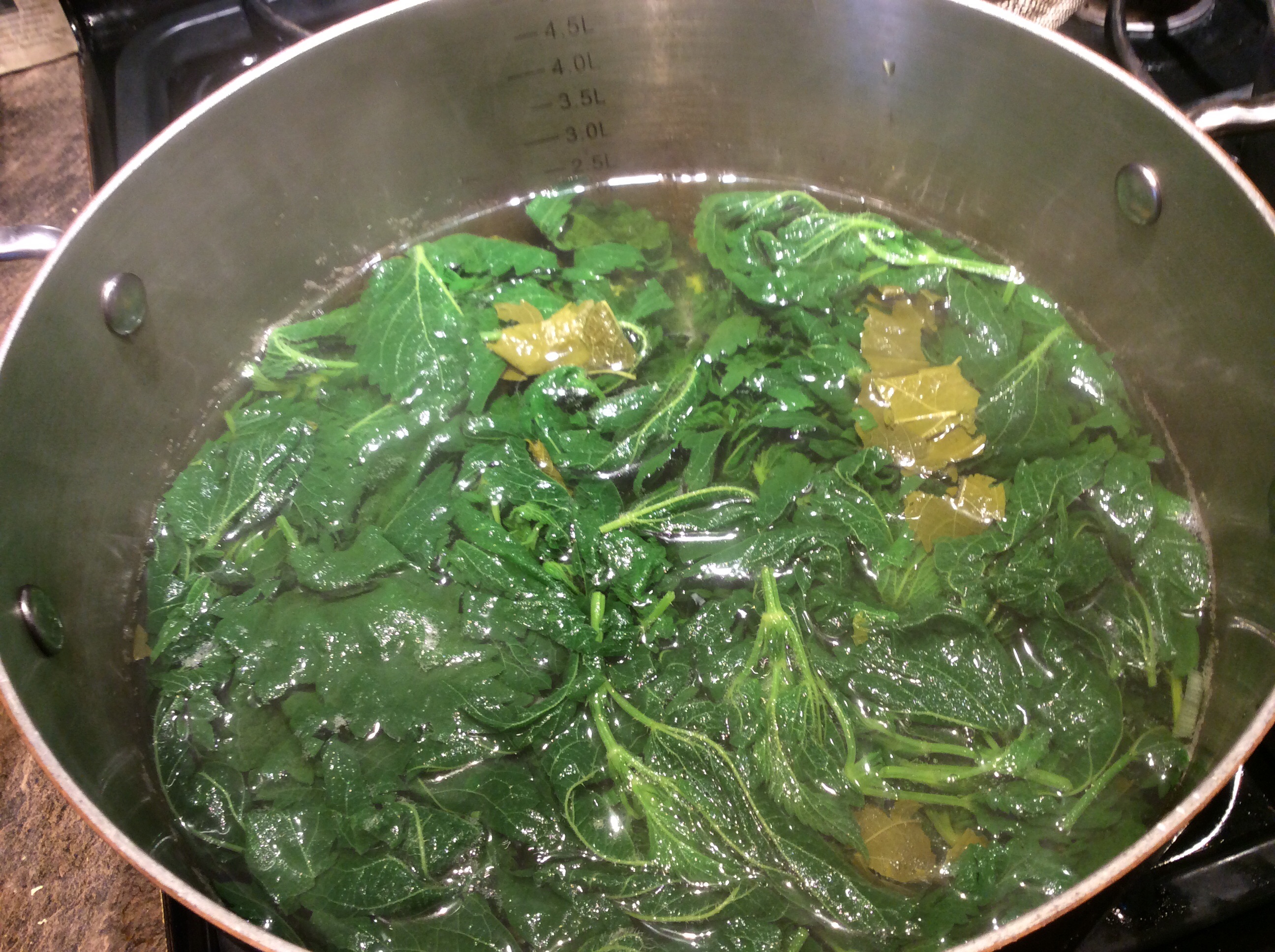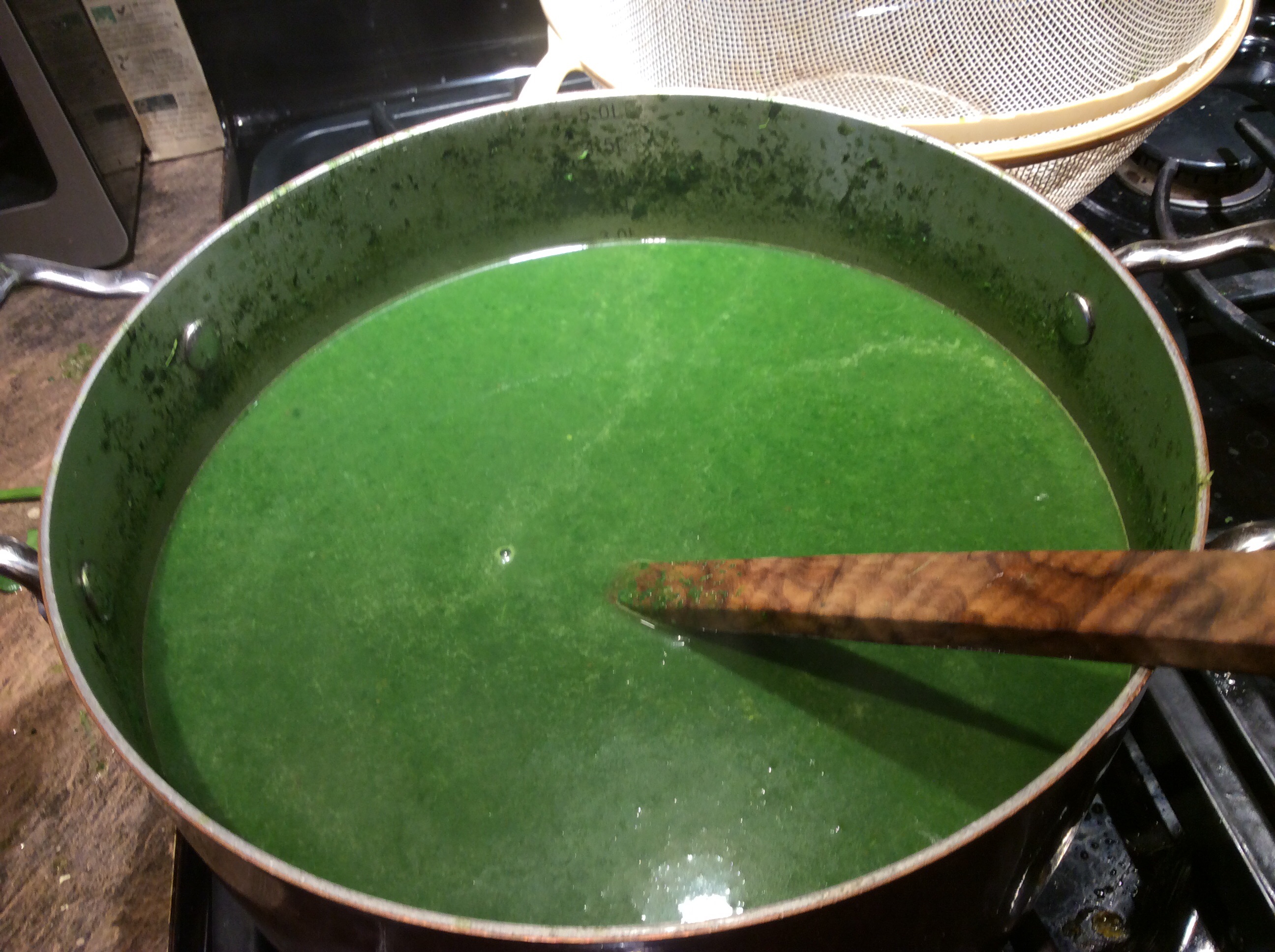 When the garlic mixture is ready and the stock is boiling, begin adding the greens to the stock, stirring, and remembering not to touch those nettles. Boil for about a minute after the last of the greens is added. Now add the garlic mixture to the soup pot and simmer for five minutes.