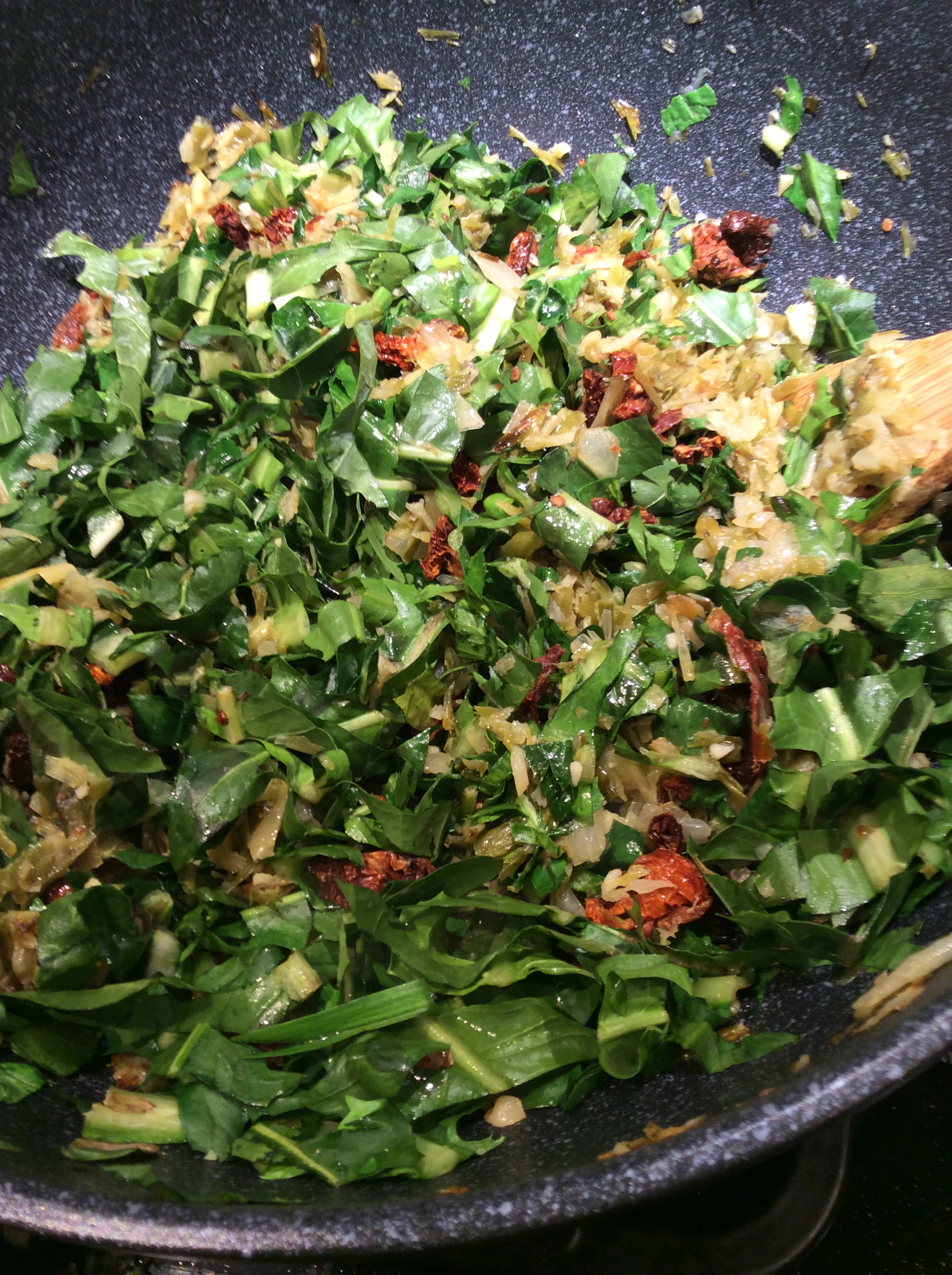 When the onion was a nice toffee color I added the chopped green alliums, cooked about another five minutes, then added the other greens and some more olive oil along with about a teaspoon of salt. Don’t stint on the olive oil. You want sautéed flavor, not steamed flavor.  The heat was turned up to medium and the whole mass stirred and turned with a wide wooden spoon about every five minutes to keep it cooking evenly. As soon as the greens were in the pan I ground the sun dried tomatoes into small powdery chunks in the blender and added them to the wok. They rehydrated well enough in the moisture from the leaves.  Keep cooking until the greens are soft when chewed.