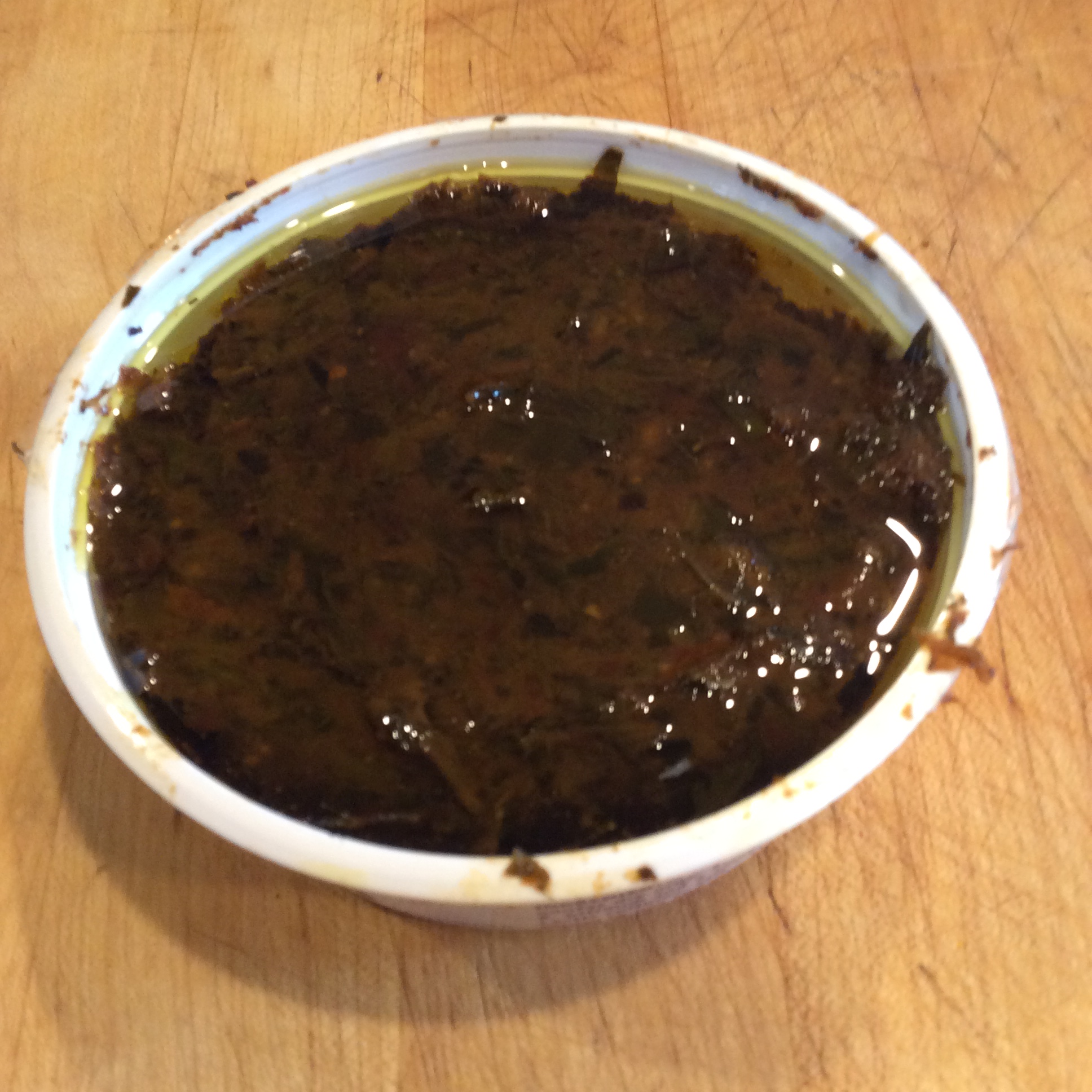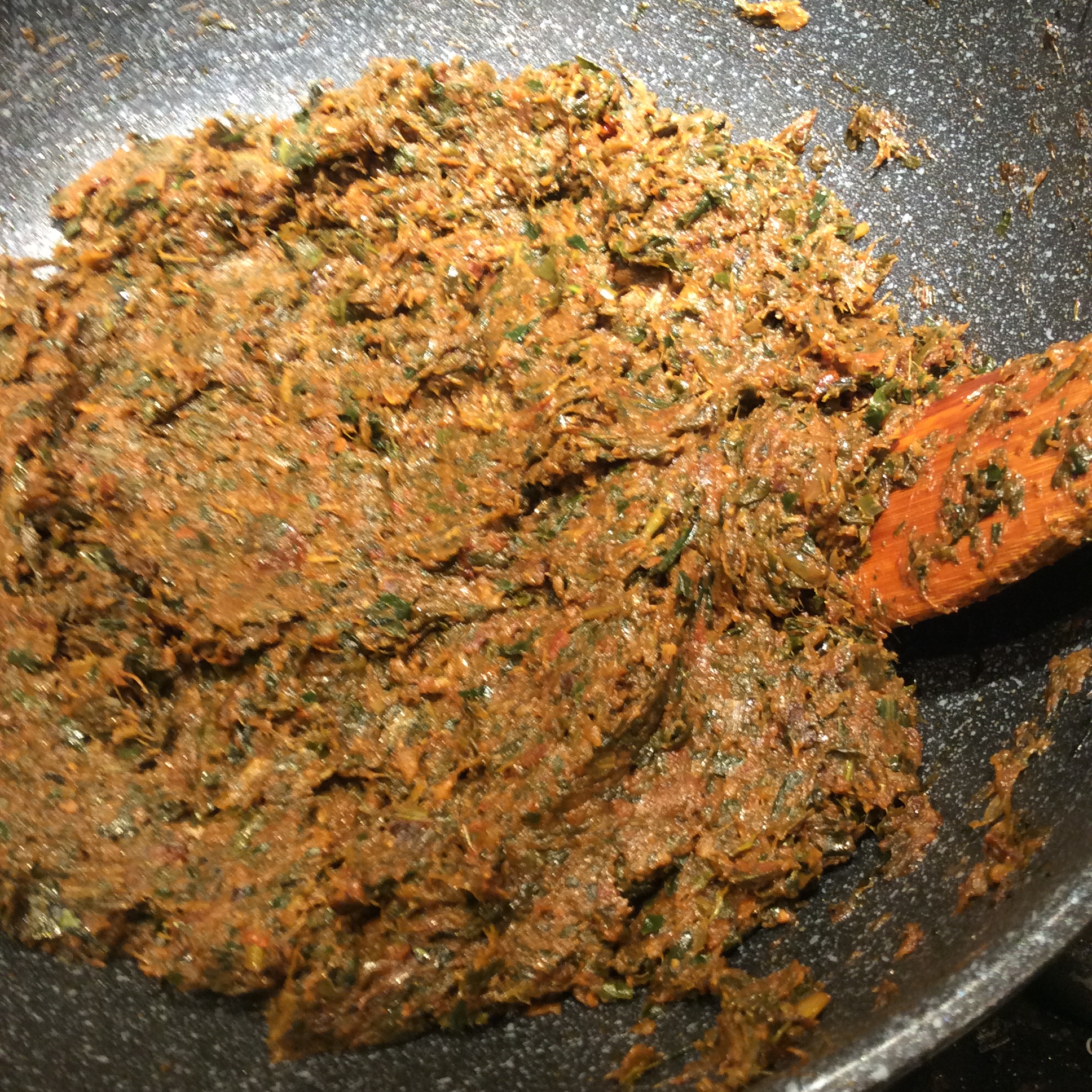 When you have a darkened dense mass of soft greens, put the whole business in the food processor and grind to the finest paste that you can achieve. Taste. You want it on the salty side, because that helps with preservation and it’s going to be diluted later. Add more salt if needed. I prefer to use fish sauce rather than salt to season at this point because it adds a wonderful rich savor. I used about a tablespoon. Don’t use this if you might be serving vegetarians.