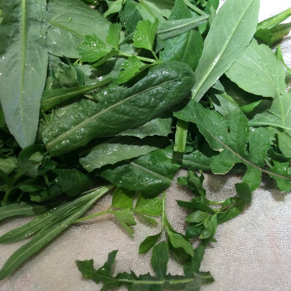 Chop up the various fresh leaves and stems into small pieces, crumble the oregano a bit, chop the steamed spinach or similar if not already chopped.