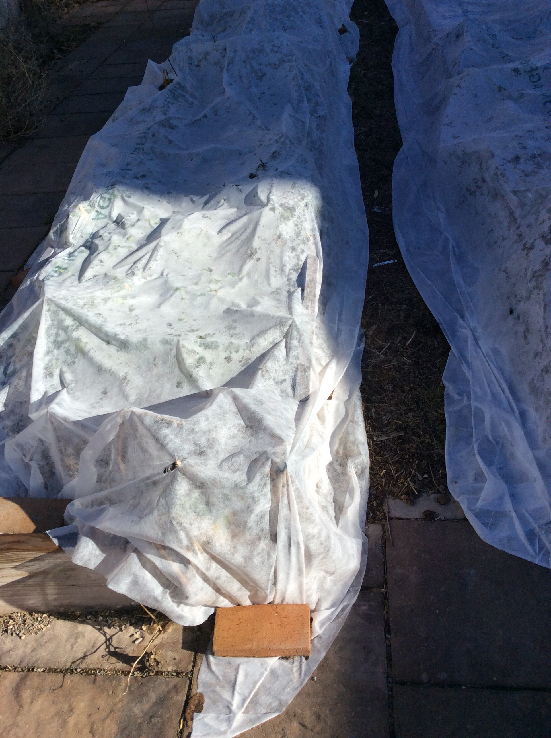 Next, hunt your frost blankets. I cannot say enough good things about the heaviest weight of Agribon agricultural fabric, the one called Agribon 70. I got mine from Johnny’s Selected Seeds. After a couple of years of fooling around with lighter fabric or two layers of lighter fabric, I have concluded that nothing but the 70 is worth spending my money on. The others all tear in our desert windstorms allowing the plants I have tended so carefully to be dessicated and killed. It comes in rolls of 12 foot wide fabric, and 100 feet of it is one of the best gardening investments I ever made.