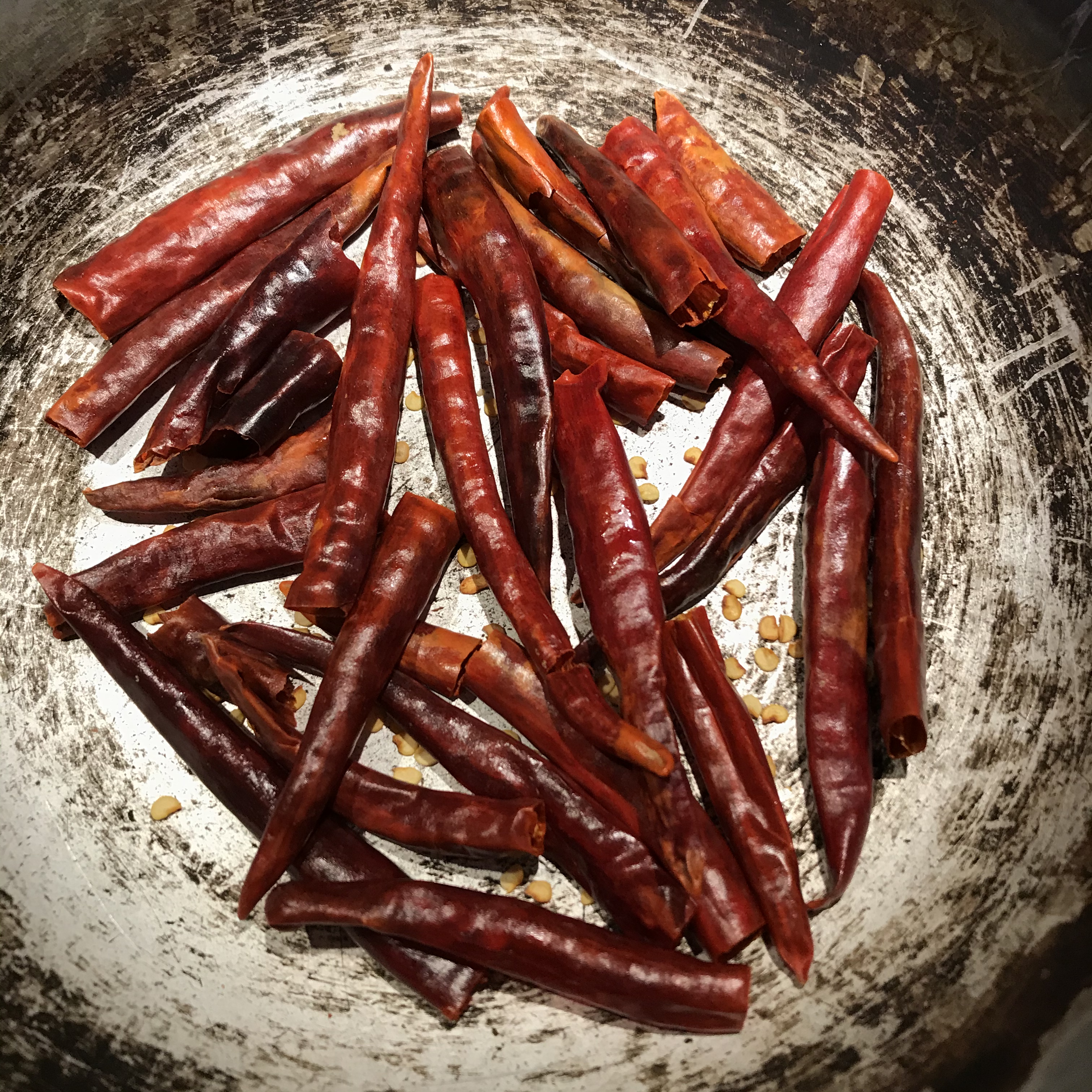 Snip the stem end off each chile and shake out all the seeds you can. Discard the seeds. Put the chiles in a small saucepan over the lowest heat and cook somewhere between 20 and 30 minutes, stirring and shaking occasionally. When you start, notice the sound they make when you stir them, because your best indication that they are done is when the sound becomes higher pitched and somehow drier. They will be a couple of shades darker and a little smoother and glossier than when you started, and more brittle if you squeeze one between your fingers. Be careful not to scorch them.