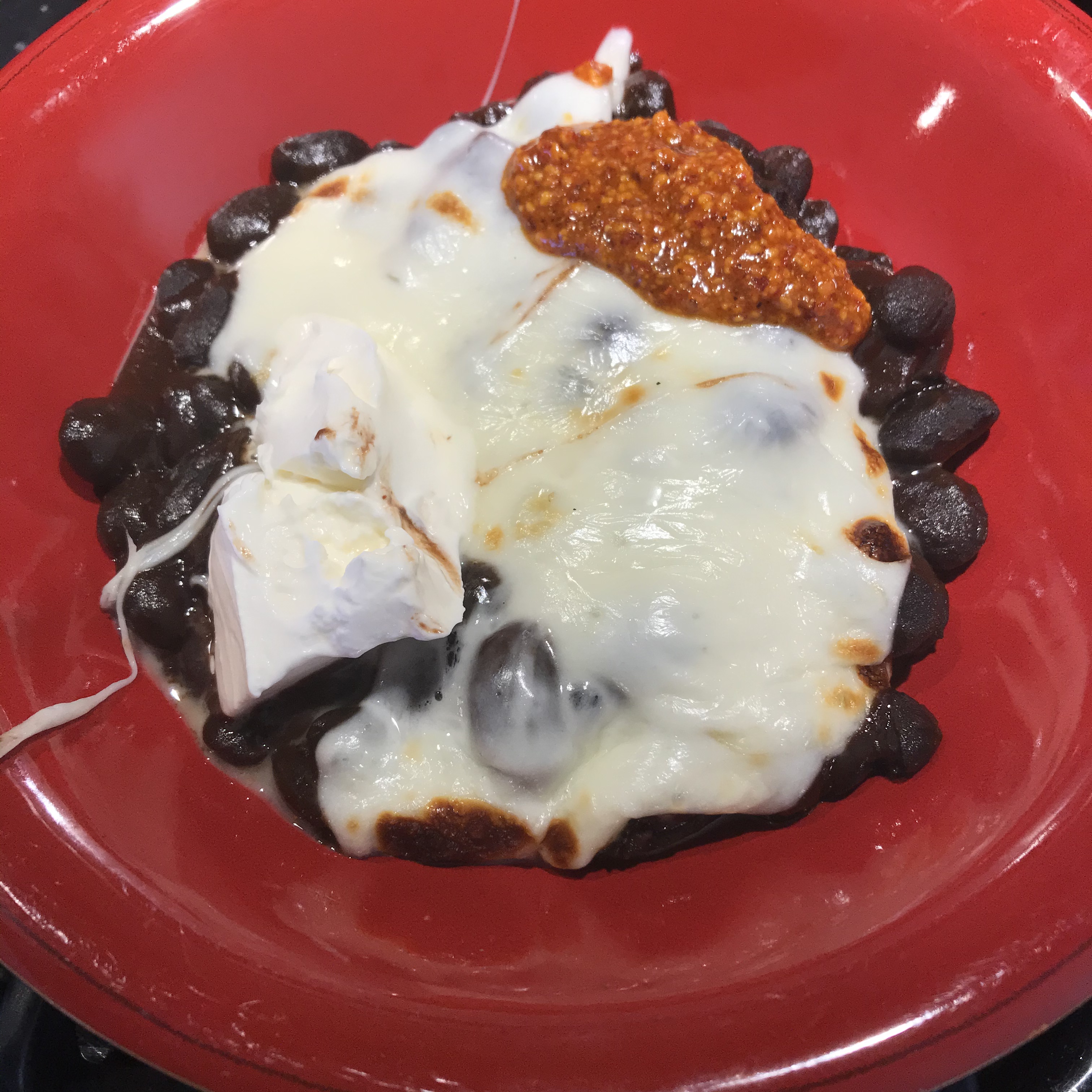 It’s great on a grilled tortilla as a snack or cook’s treat, and good as a table condiment with any dish that isn’t too delicate in flavor. I’ve enjoyed it with shrimp rubbed with chipotle and garlic and grilled. It would be good with simply cooked and salted earthy greens. Today I dished up simply cooked black beans from Rancho Gordo, grilled some asadero on top, and dolloped some creme fraiche and salsa macha on the side. Simple, filling, and interesting to eat.