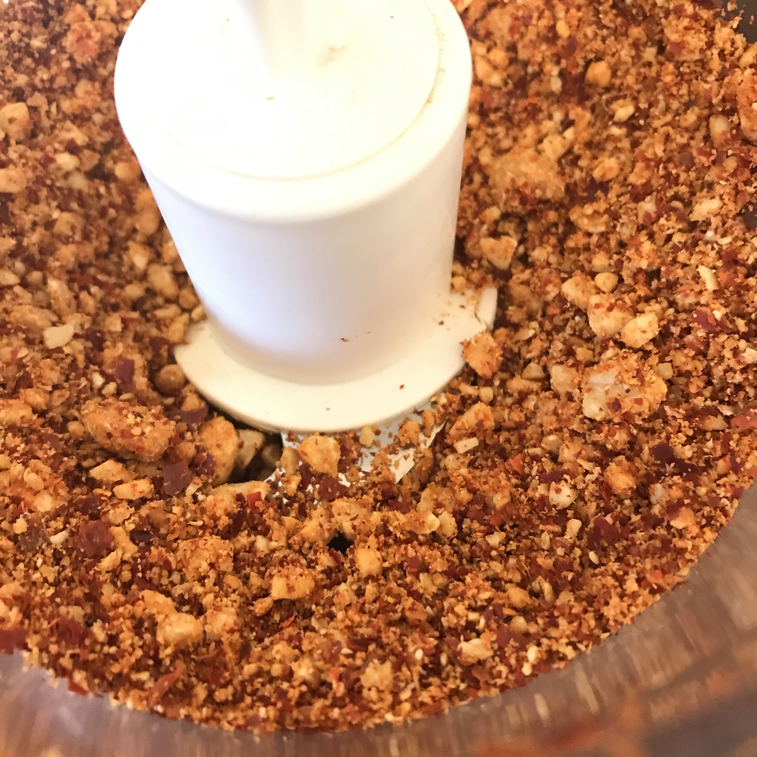 Grind the chiles in the spice grinder to a fine powder. Put the powder in the mini prep and add the peanuts. Process until the mixture looks like coarse crumbs.